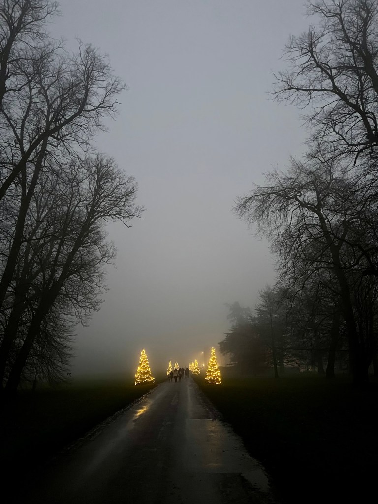 We left the house to find that darkness had fallen and the mist had come in. The Christmas trees lining the driveway were twinkling and the Christmas music played in the courtyard. There is a cafe and shop as you come out of Narnia and the shop was open in the stable courtyard as well.