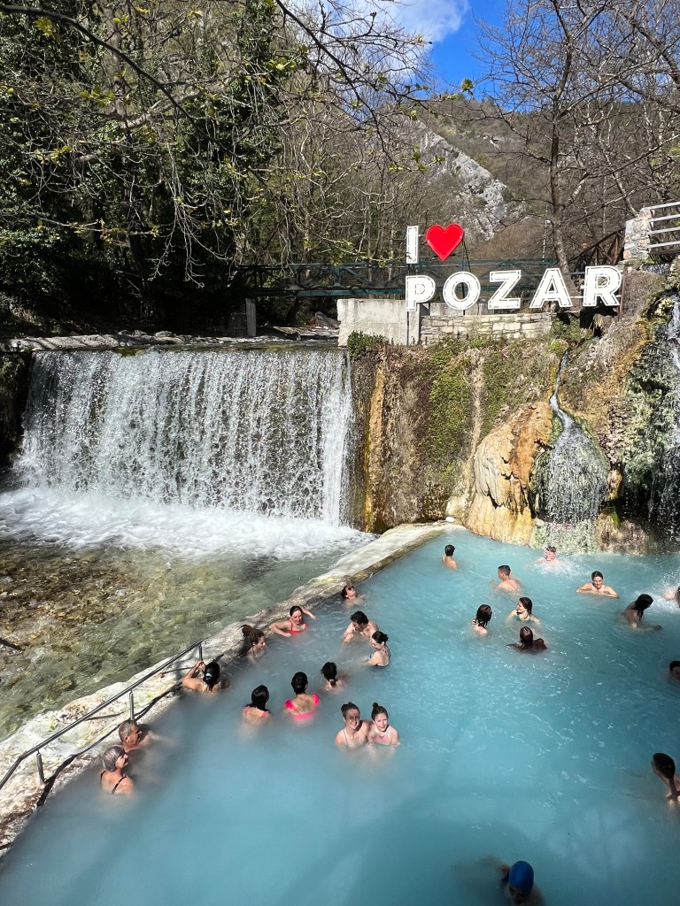 Pozar thermal baths are natural thermal spring water pools set in a beautiful gorge next to a crystal clear river. There are 3 main outdoor pools, the first is a cloudy pool with a silica gravel bottom with a warm water fall. This one is also right next to the river and waterfall if you are brave you can try the freezing cold river and then the warm pool. The second is a crystal clear warm pool and the third is a proper swimming pool. Each pool costs a couple of Euros each to enter. The complex also includes cafes and restaurants, indoor pools, private pools and ,massage treatments. There are changing cubicles and showers but they are fairly basic. If you are doing the trip yourself there are several walking trails in the gorge and it really is a beautiful area.