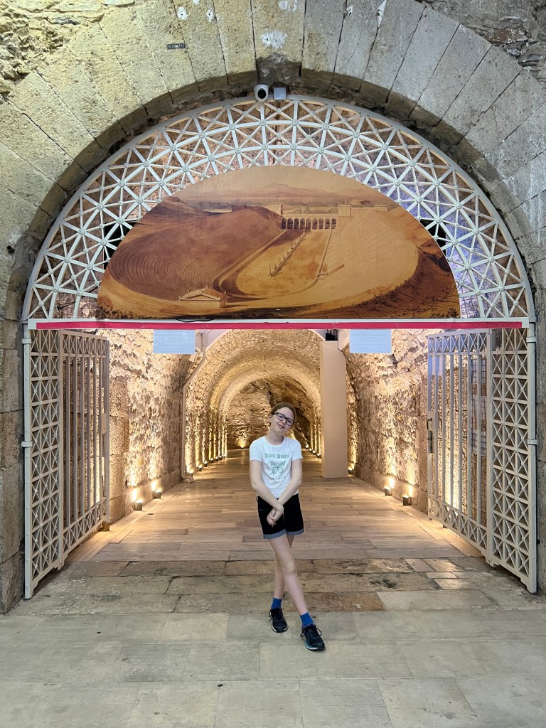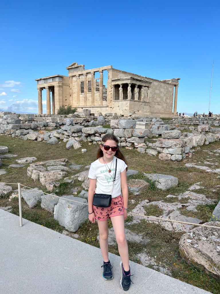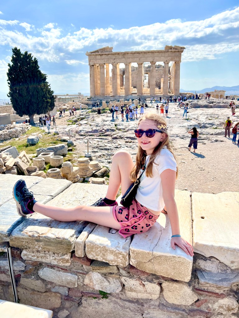 Our final tour in Athens was to the Acropolis and Acropolis museum. Again we did a kid friendly tour with Kids Love Greece which was perfect for Pip as she could ask lots of questions and focus on the things she was really interested in. We visited the Acropolis first and spent time learning about the history and visiting the temples, amphitheatre and structures. Our tour guide brought an ipad with her so that Pip could see what the buildings would have looked like when they were built. We then visited the Acropolis museum to see the statues and treasures up close.