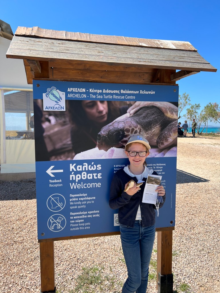 After theTemple we drove back towards Athens and stopped at Archelon Sea Turtle Rescue Centre where we had a tour of the centre, met some of the residents, learned all about turtles and the work that the centre does and even adopted our own baby turtle. Pip is already planning on going back to volunteer when she is old enough.