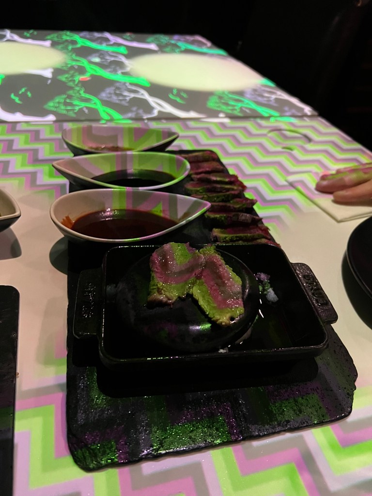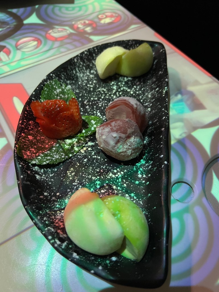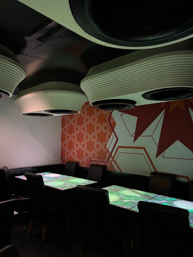 We booked online and your booking gives you a 1.5 hour timeslot at your table. The restaurant is quite dark when you enter and is laid out over 3 floors. From the time you sit down, everything is done via your interactive table top projected from above you.