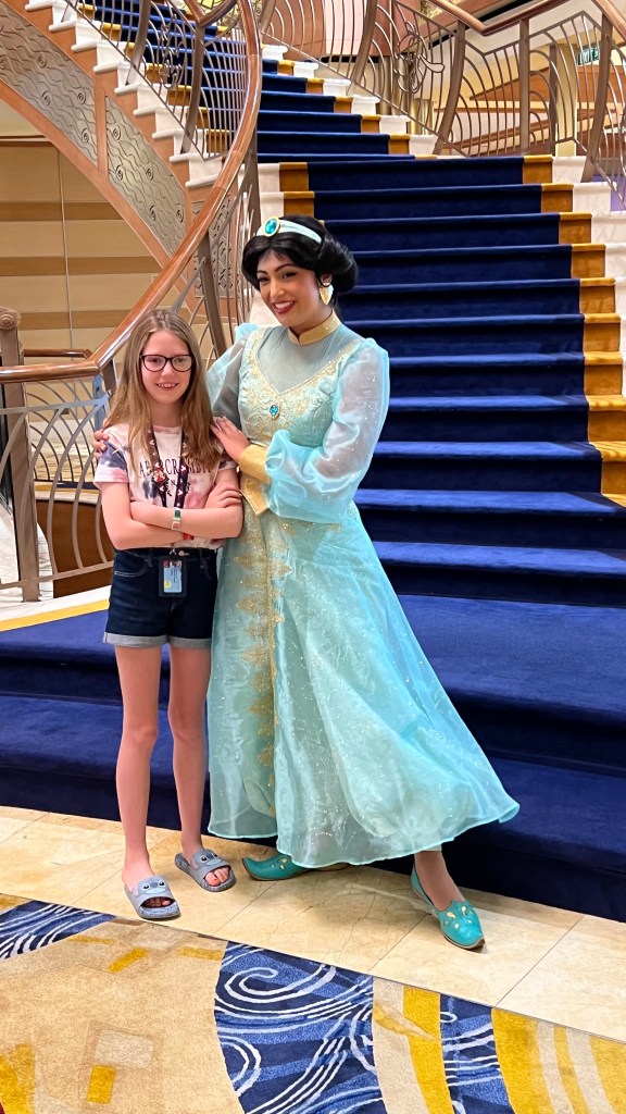 We also had a booking for The Royal Gathering which is an opportunity to meet several of the Princesses at once in the Grand hall. We managed to meet Rapunzel, Belle, Tiana and Jasmine who stand in an line and you move down and get to speak to each one and have your photo taken. Pip may have been a little old for this but Andy really enjoyed meeting Princess Jasmine!