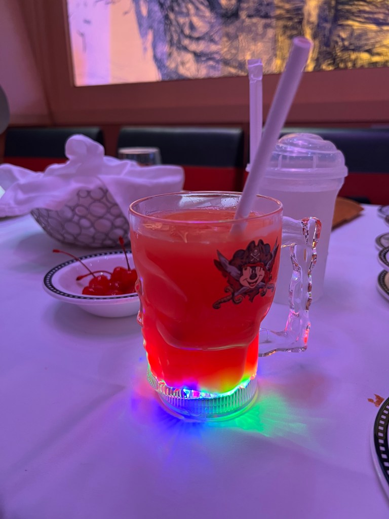 On this evening all the restaurants on the ship serve the same pirate themed menu. The screens in Animators Palete show artwork from the various Disney pirate films and servers are dressed up. There was a pirate themed cup available to buy which was shaped like a skull and lit up. This came with a kids cocktail which Pip really enjoyed.