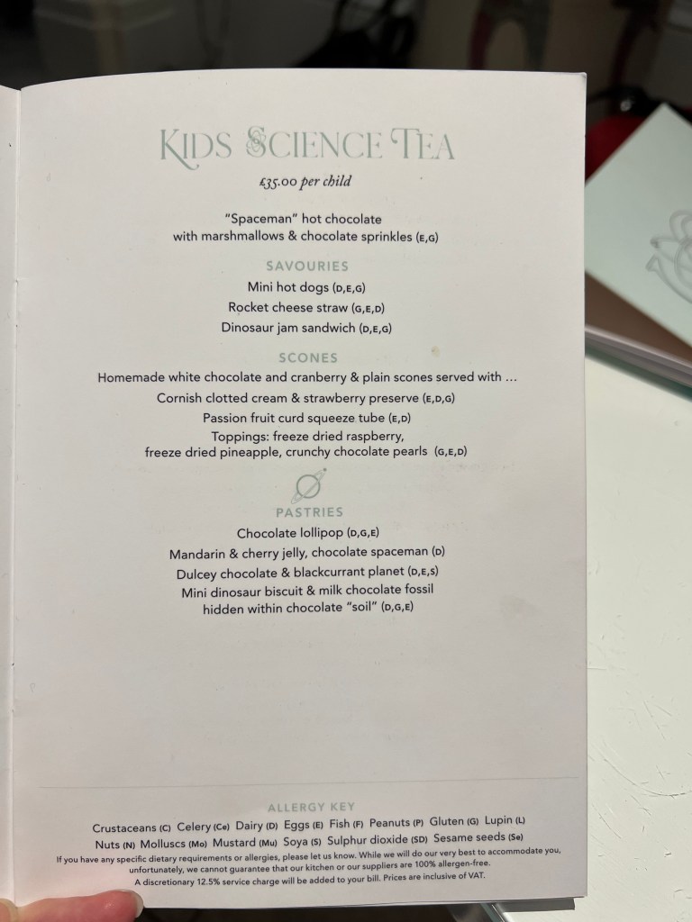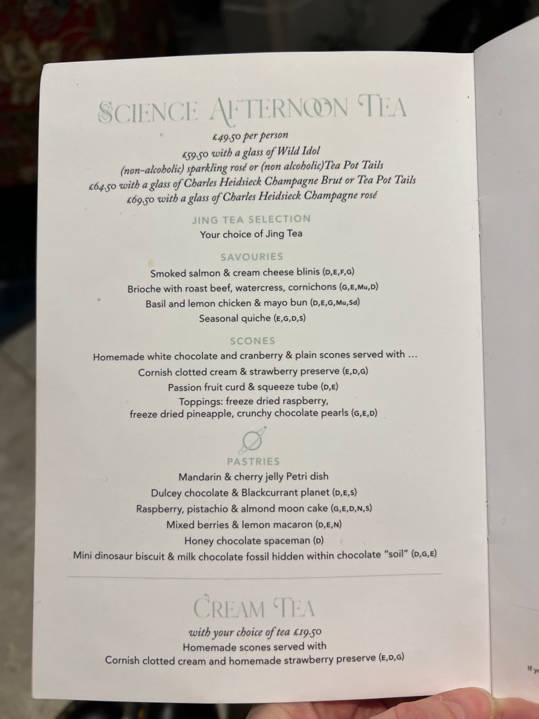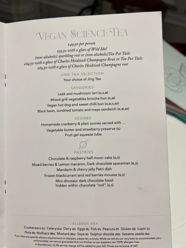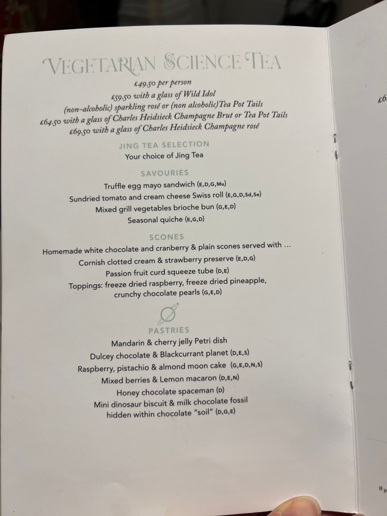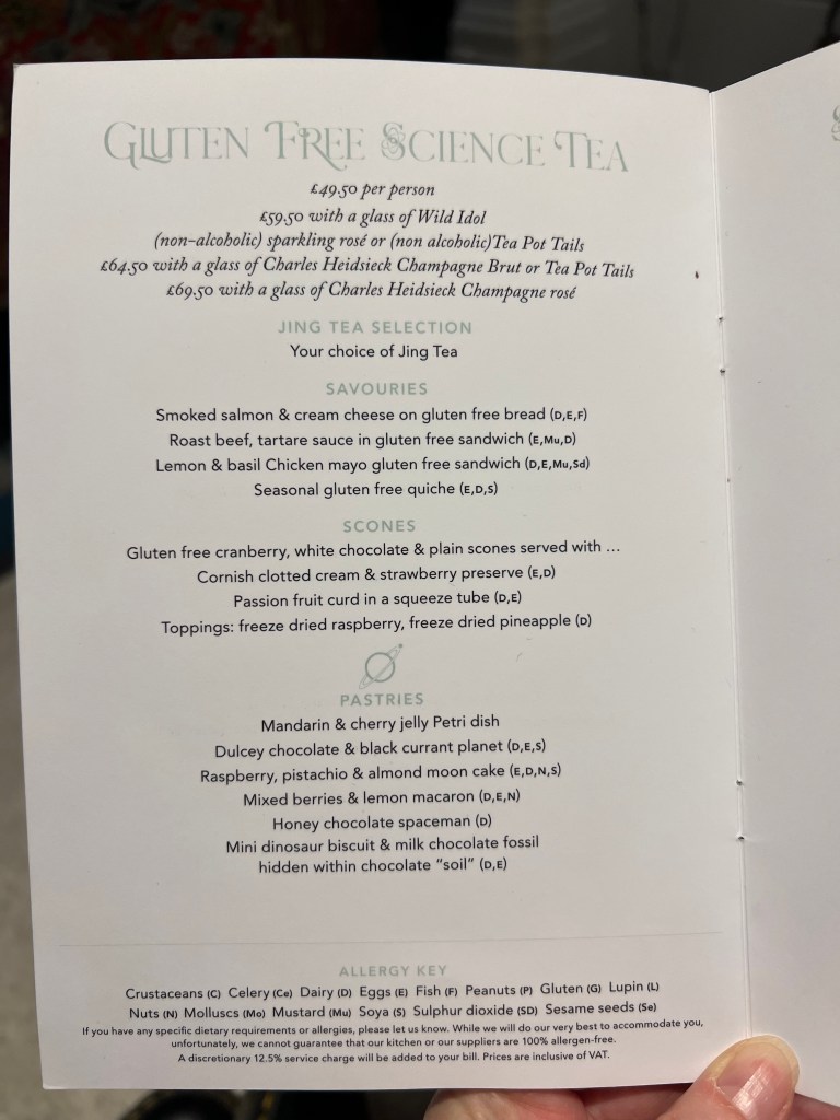 There is a set menu for the Science Afternoon Tea with options for Vegetarian, Vegan and Gluten-free afternoon teas. The adult menu is different from the child menu both in content and experience. Menus can be found here. There is also the option to have just a cream tea (tea with jam and scones).