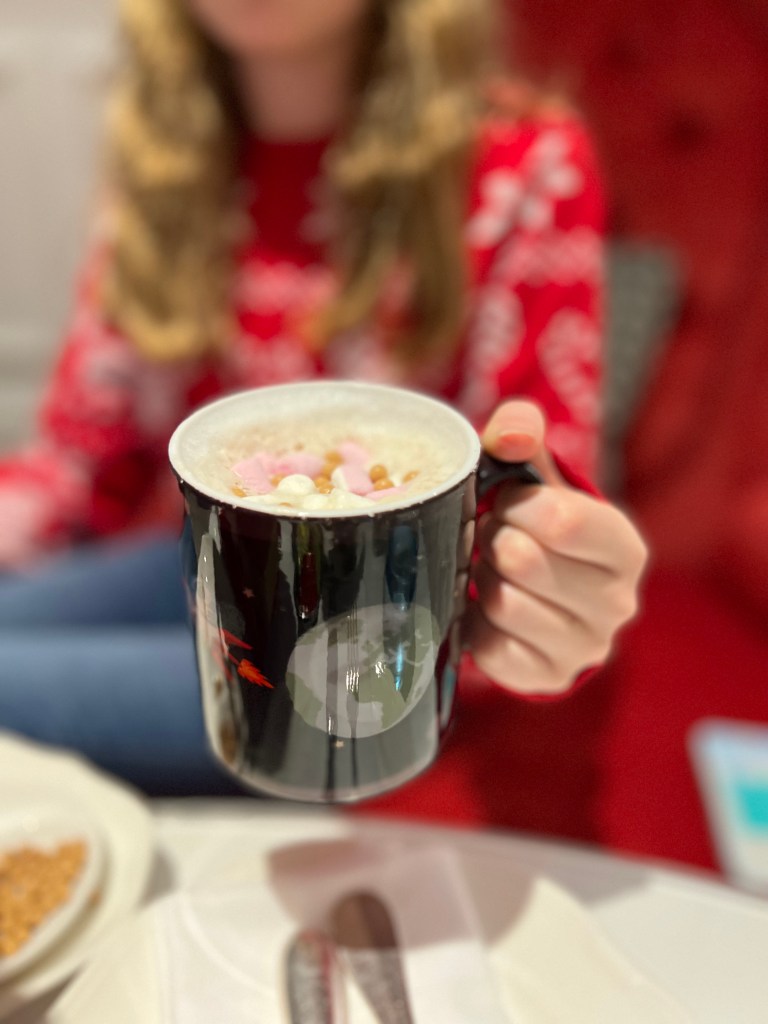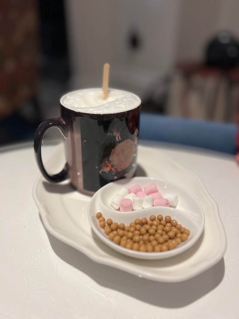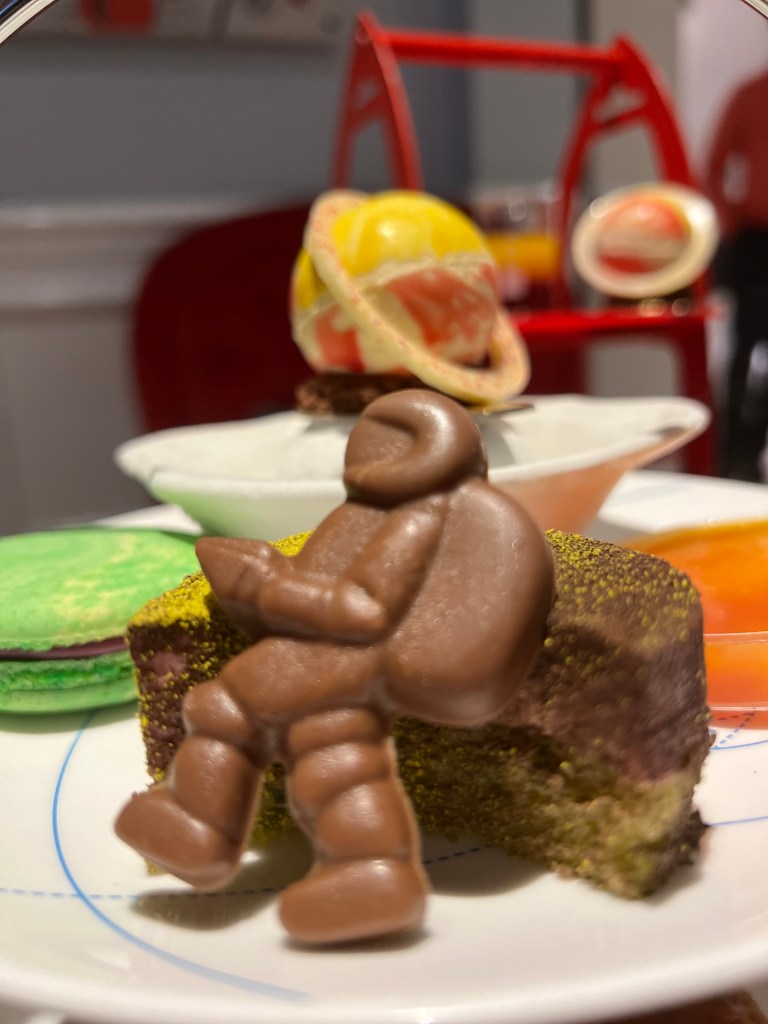 Pip’s afternoon tea also came with a DIY hot chocolate; a mug of hot milk, astronaut chocolate stirrer and toppings.