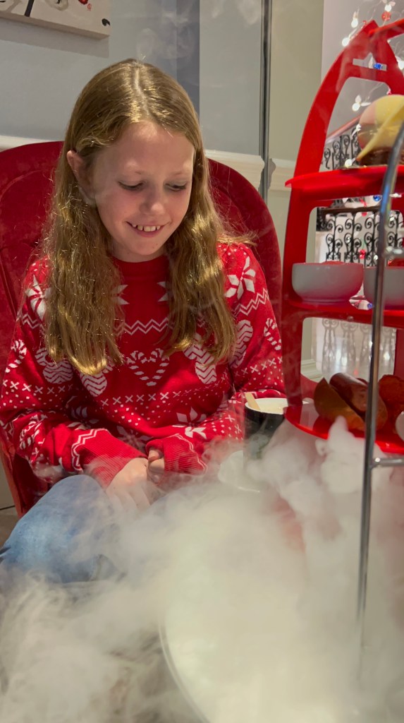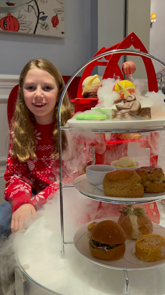 The afternoon tea stands came out next. Mine was a traditional stand with sandwiches on the bottom, scones in the middle and cakes at the top. Pip’s was in the shape of a space rocket which then had dry ice added to it so it seemed that Pip’s rocket was about to blast off in to space!