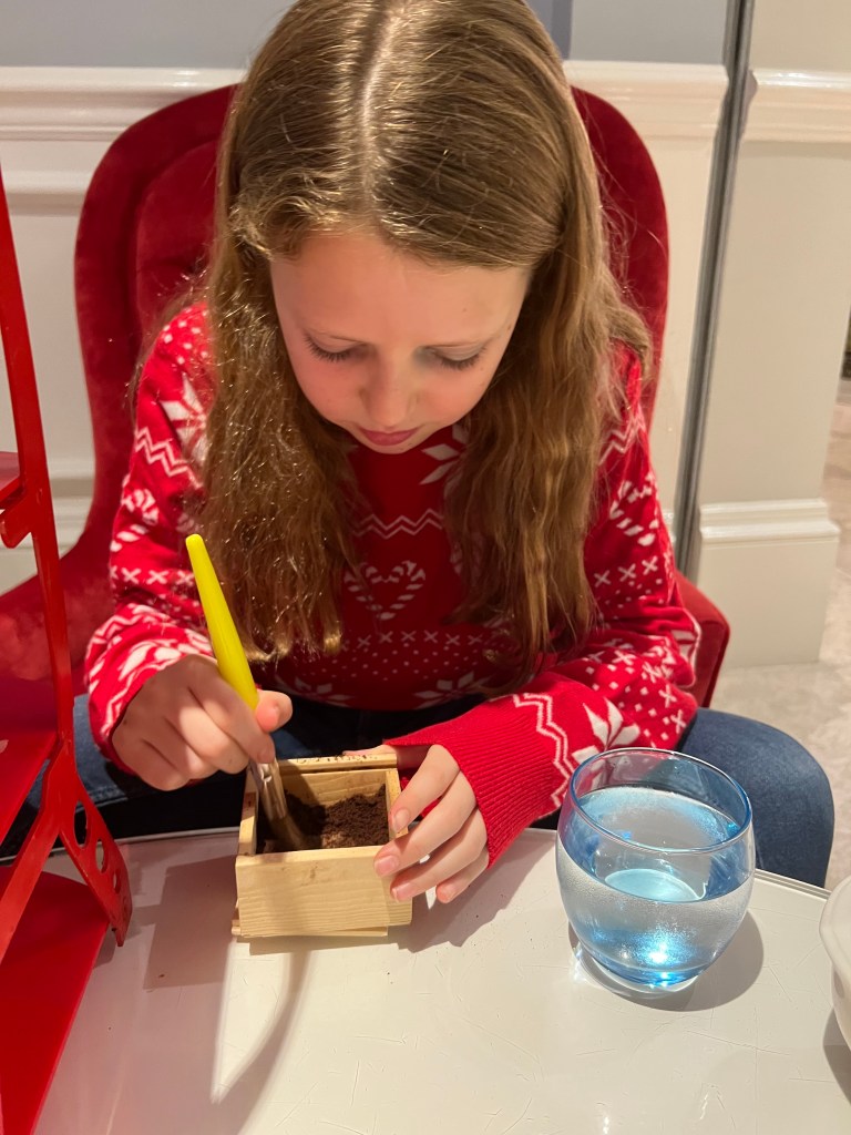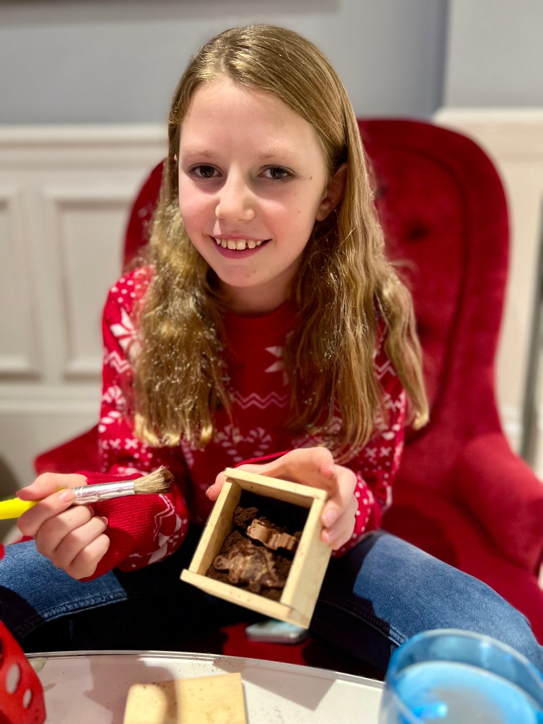 Pip’s also came with a small wooden box and a paint brush. The box was filled with chocolate shavings and the paintbrush was to allow her to conduct her own archaeological dig to find chocolate dinosaurs.