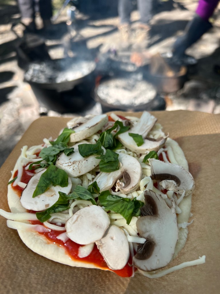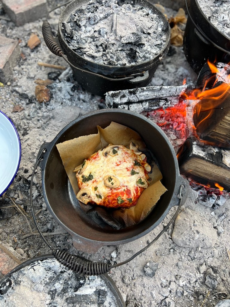 Lunch was mini pizzas with the dough made by one of the group and topped with a selection of toppings put out for us to choose from, again cooked in dutch ovens over the fire while we sat and chatted.