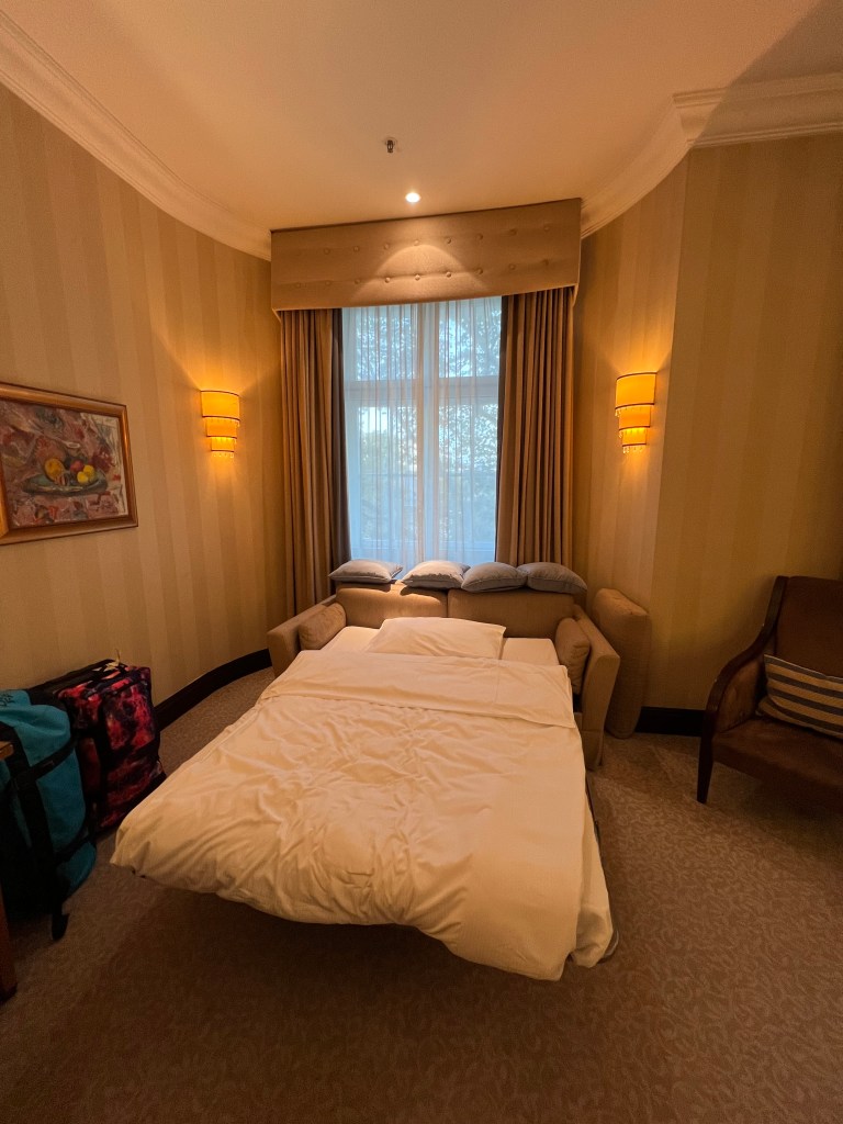 Our room had a large double bed and a sofa bed for Pip with an ensuite bathroom. The hotel is decorated classically but with all the mod cons you could need including excellent wifi.