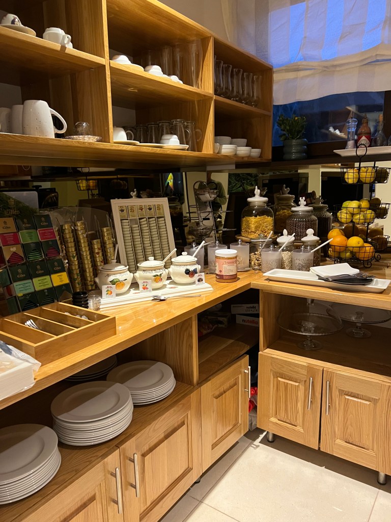 The hotel serves an extensive breakfast. There is a small kitchen area where you can help yourself to cereals, breads, fruit, yogurts, juices and hot drinks. There is also a selection of cooked breakfast items such as eggs, omelets and sausages. They will also cook items to order to cater for allergies. The breakfast even included home grown figs which were delicious.