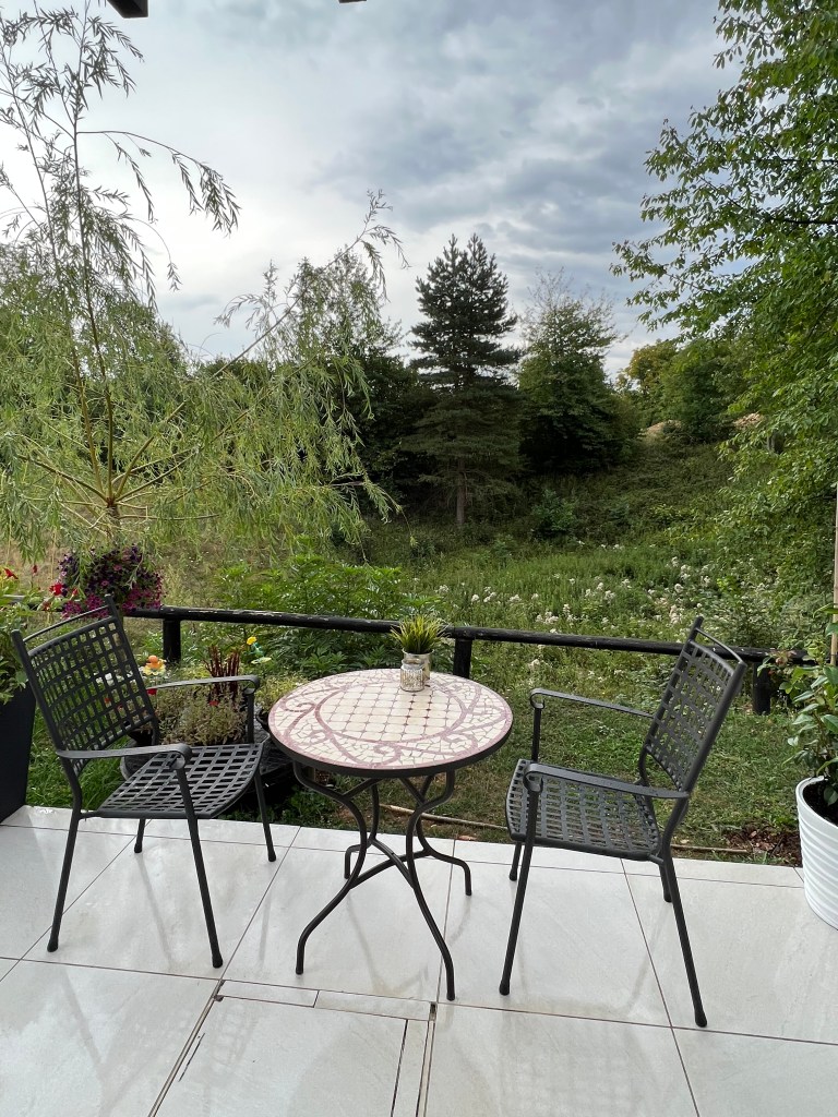 On the lower floor there is the kitchen and breakfast area. There is a large outdoor terrace and seating area at the back of the property where you can have drinks or a meal.