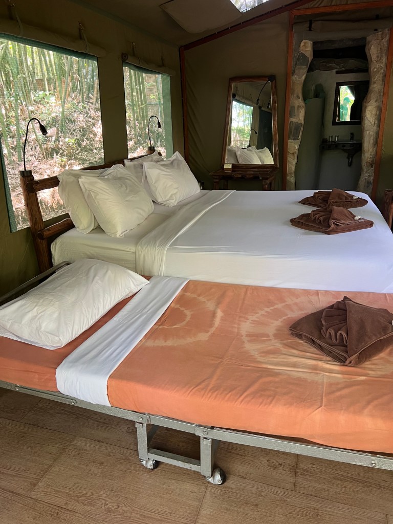 Sleeping accommodation is in luxury tents. The tents come with a double bed and en-suite bathroom. They also have electricity, tea making facilities and a large fan which did a great job of keeping us cool. The tents are more comfortable than some hotels we have stayed in.