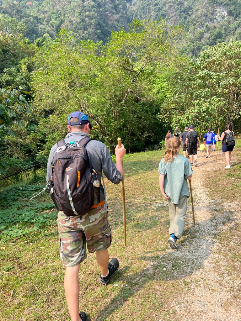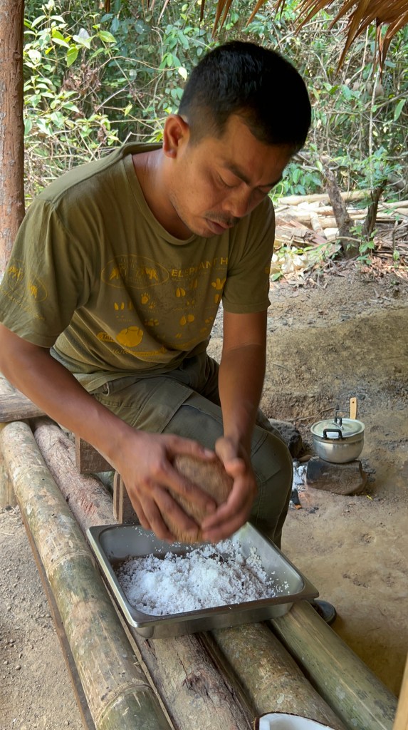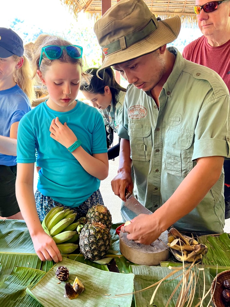 We hiked for about an hour and a half through the jungle at a slow pace with lots of stops to learn about the wildlife and plants. The ground was uneven in places and there was some scrambling in areas and it was very hot but it wasn’t unmanageable. The hike finished at our lunch spot which was a shelter with a fire where we were taught to cook various dishes. It felt like we were middle of nowhere but when we heard the lunch gong at the Elephant Hills camp we realised that we were just across the river from the main camp.