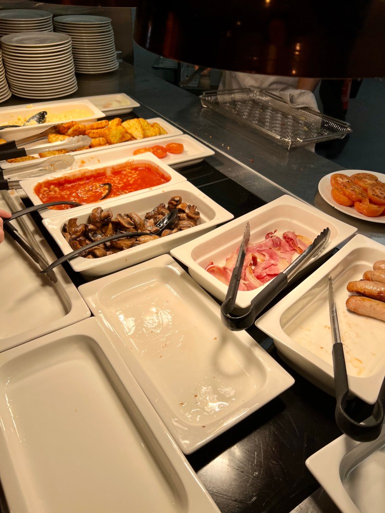 A breakfast buffet is served in the main restaurant every morning with a choice of continental or cooked breakfasts. The continental breakfast includes a selection of cereals, fruit and yogurt and a selection of bread and pastries. The cooked breakfast includes everything and also your choice of sausage, bacon, beans, eggs and hash browns (they also has vegetarian sausages and bacon).