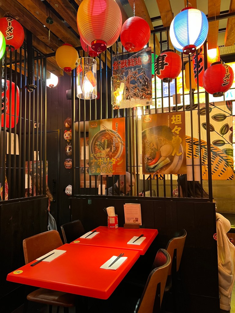 Outside the restaurant you will find a giant bowl of noodles and a small seating area, inside there are a mixture of booths and tables and you can also eat at the bar watching the food being made.