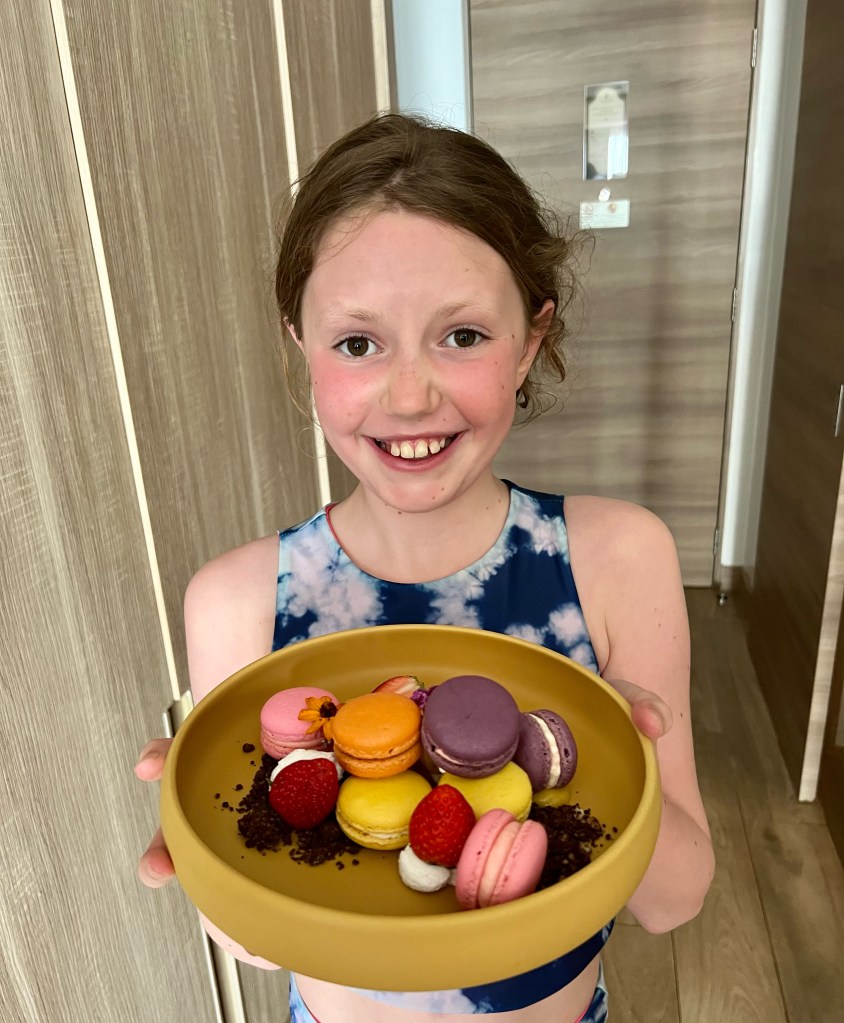 Afternoon tea – this is served in a variety of spots around the hotel including you room and we had it in the Portosino restaurant. Afternoon tea came with a choice of tea, tiny sandwiches and savouries and a selection of miniature cakes. There was plenty of food for the 3 of us and we even took some back to our room for later.