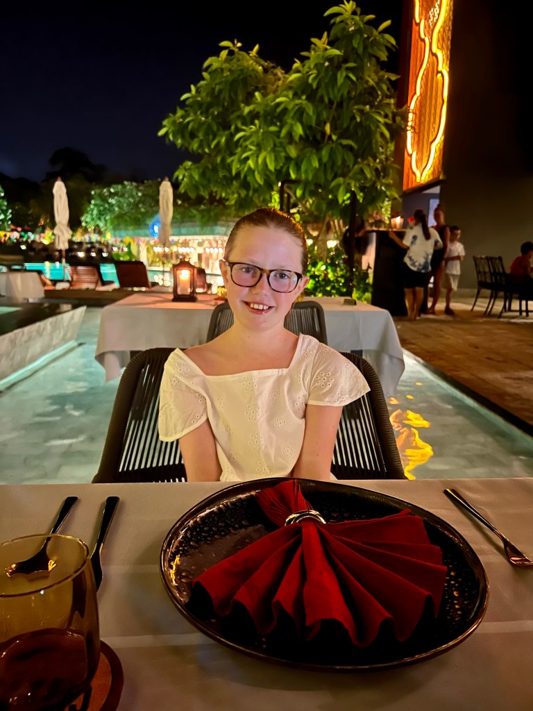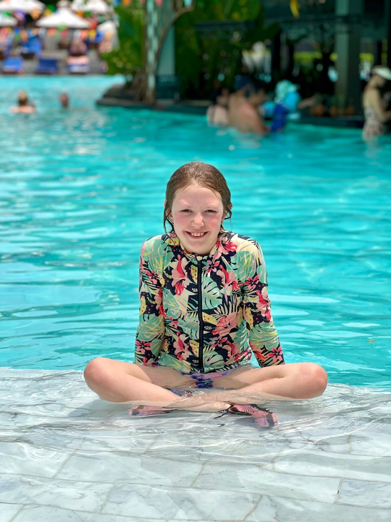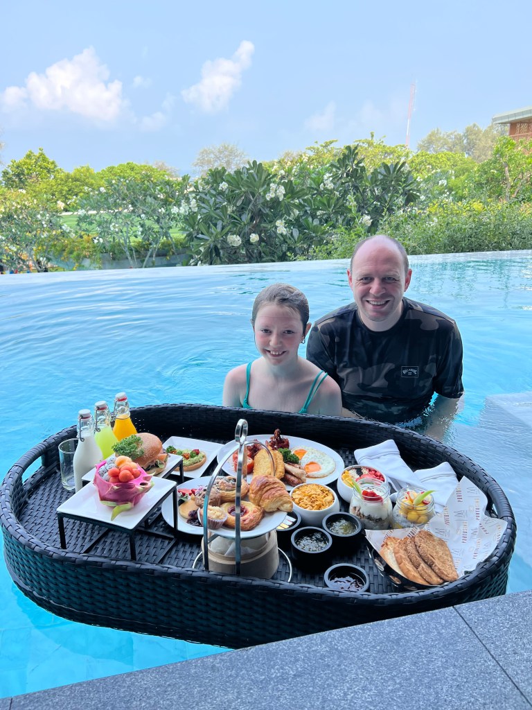 The pool access suite has access to a small pool that runs the length of about 7 rooms on the first floor over looking the main pool and towards the sea. We hadn’t actually booked this room but when we checked in there was a problem with our room so they upgraded us for one night. Pip was so happy with this that she spent most of the 24 hours that we had the room for in the pool. We also took full advantage of having the room and ordered a floating breakfast which despite being for 2 people was for too much food for the 3 of us to eat.