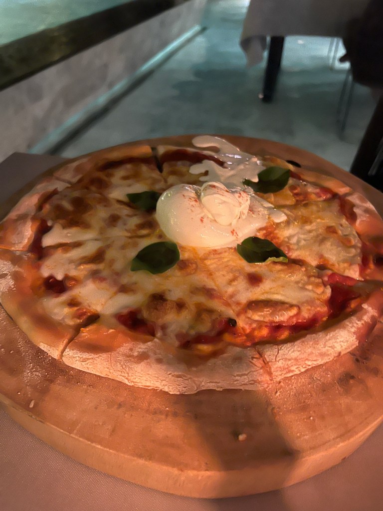 Char’d serves pizza and steaks. These are served outdoors either around the water feature area or in it, you can dine with your feet in the warm shallow water. We ate her on our first evening and really enjoyed our pizzas.