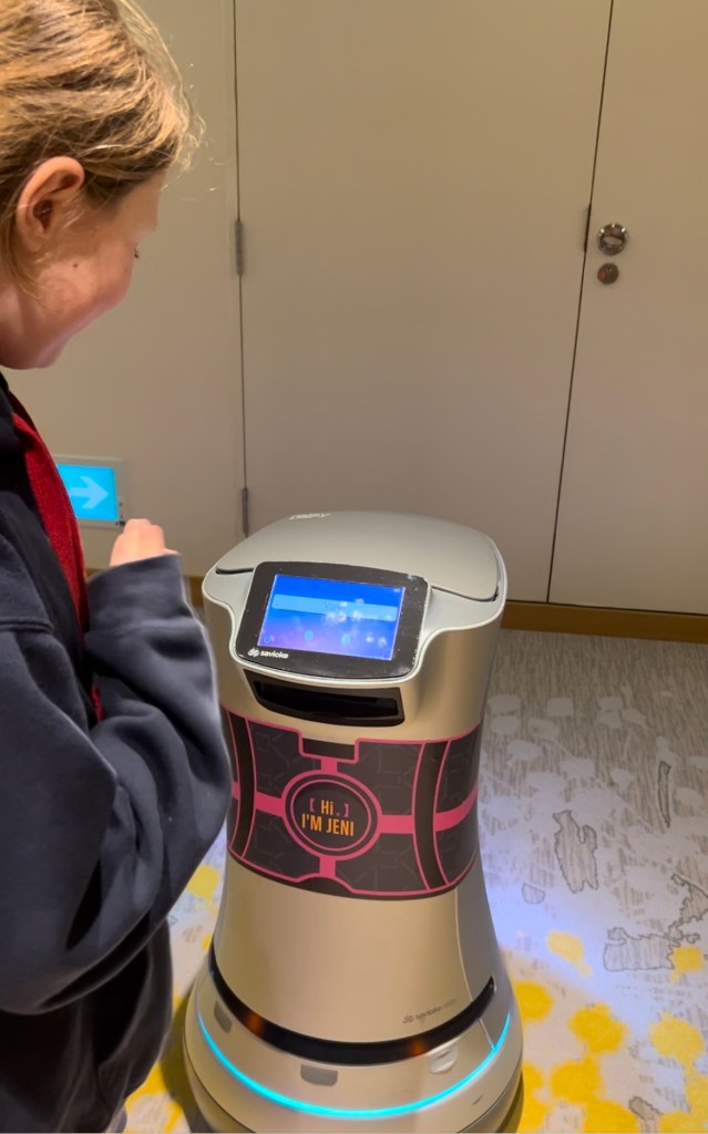 Room service robots – there are two robots in the lobby waiting to bring you either a chocolate or a cookie surprise to your room. You simply dial room service and ask for one and the robot will bring it up to the room. Pip spend our whole stay asking if she could get one and was delighted to answer the door to the robot with her cookies. We then stalked it back to the lifts to see how it used them!!