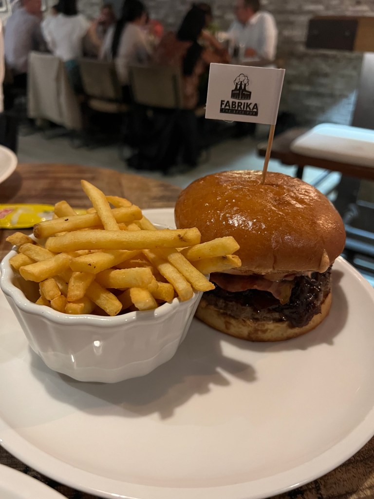 The first evening in Bratislava we ate in Fabrika, the restaurant at our hotel. It was an excellent choice. We were really impressed with the choice of food and when it came it was delicious. Pip and Andy chose burgers and I went for mozzarella sticks and a salad (and stole some fries!). They also have a large selection of local craft beers.