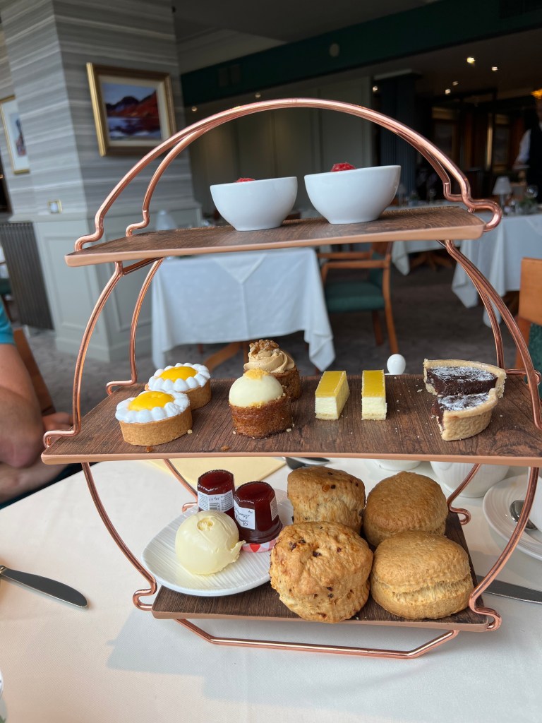 We started with afternoon tea in the Lake View restaurant which was served in a window seat overlooking the lake. We had a selection of sandwiches, savoury scones and sausage rolls and then a selection of tiny cakes and warm scones with jam and cream accompanied by a pot of tea. All totally delicious and just the right amount of food, in fact we did take some of the cakes away with us to eat later. We had a traditional afternoon tea and a vegetarian tea and there is also the option to add a glass of something alcoholic if you wish.