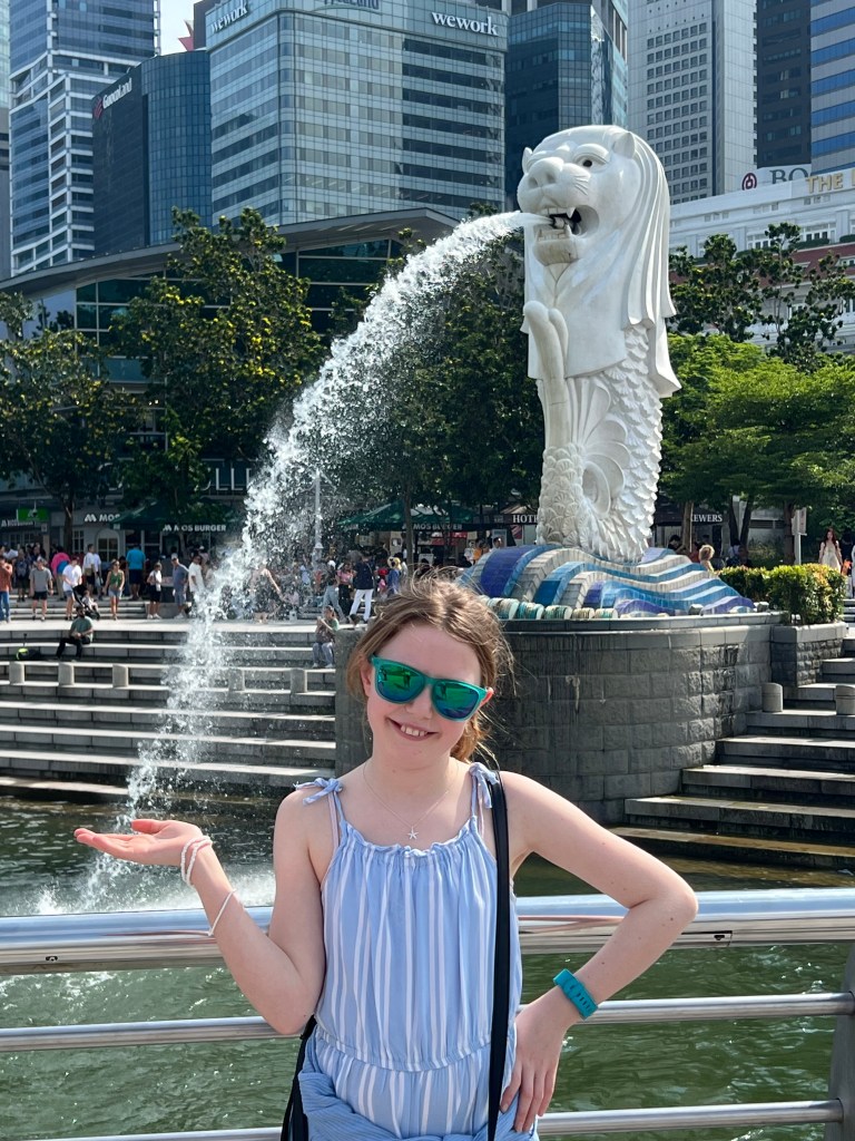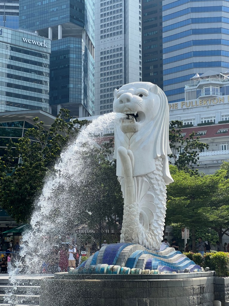 The Merlion is the symbol of Singapore. Its fish body symbolises Singapore’s origins as a fishing village and the lion represents the city’s original name of Singapura, which means lion city in Sanskrit.