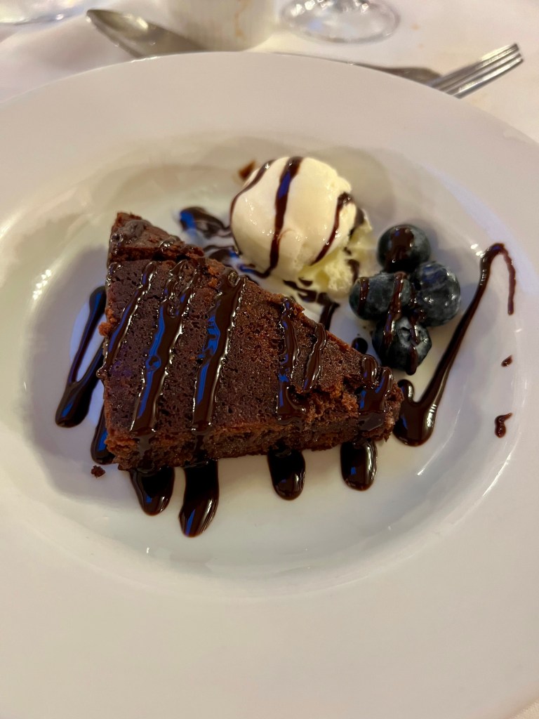 For evening dinner there is a set menu to choose from which isn’t extensive but has a reasonable choice. There is the option for either two courses or 3 in a set menu. Pip had hunter’s chicken, Andy had duck and I had a vegetarian pasta. Andy had a starter and Pip and I had deserts. We all enjoyed our dinner although I did find my pasta was incredibly spicy and not the most exciting of vegetarian choices.