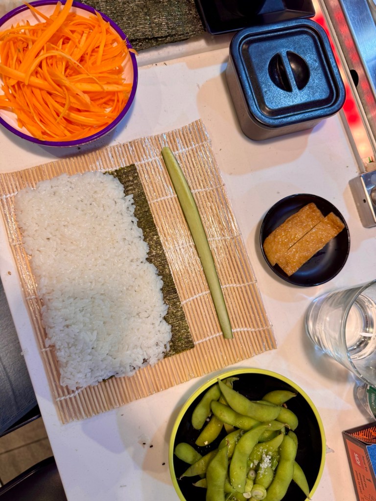 The evening was very chilled. We each had a work station set up with equipment and ingredients. The member of staff leading the evening showed us how to make 4 different types of sushi throughout the 2 hours but we worked at our own pace and choose which ingredients to include (so if there is something you don’t like then you don’t have to add it). We were able to request more of the things we liked as the evening went on.