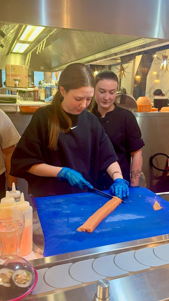 Half way through the session there was a short break where we could order drinks and have a bathroom break. After the break we were shown how to fillet salmon for the different types of sushi and then everyone was able to have a go at the knife skills needed.