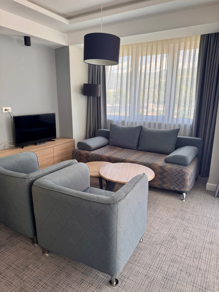 We had an apartment room which was huge. In the main area there was a double bed, a desk area with a small fridge and a seating area with a a small sofa, arm chairs and a TV.