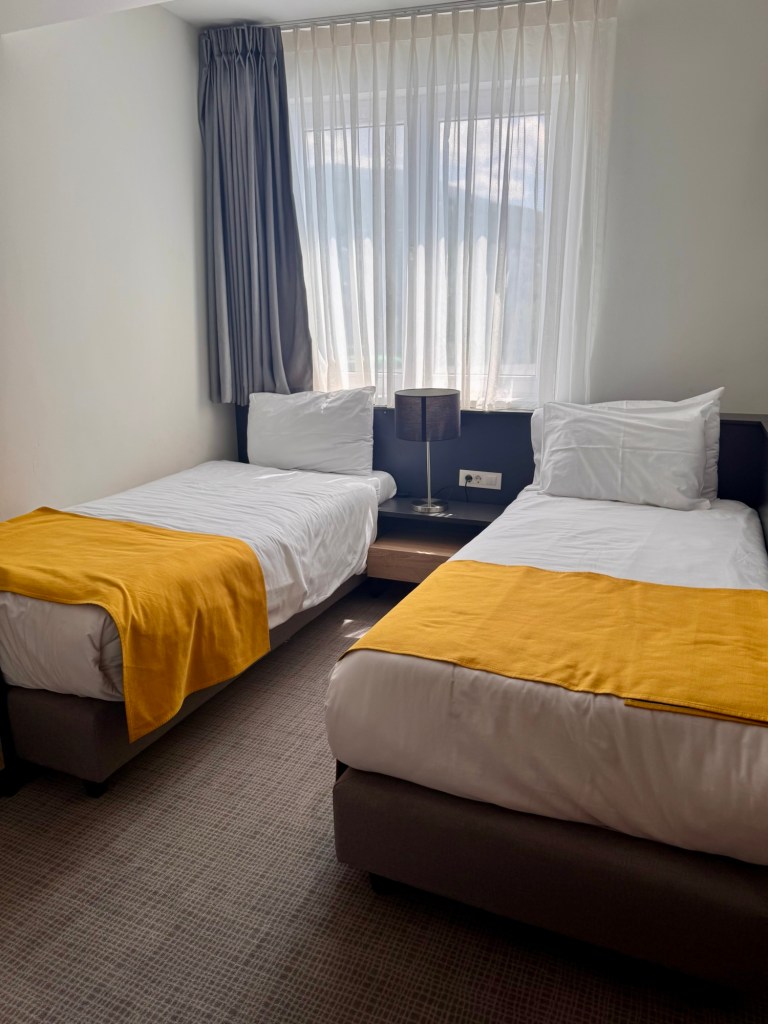 The hotel is right down at the end of the main lake front in Ohrid and at the opposite end of the strip from the old town so in a quieter spot. You are able to swim in the lake near the hotel and there are grassy areas to sunbathe on. The hotel is currently sandwiched between the football ground and tennis courts and another hotel under construction although neither of these things affected our stay at all. We loved the hotel for the size of the rooms but after exploring the old town, I think if we visited again, we would stay there as it is more picturesque and nearer the beach areas and most of the restaurants.